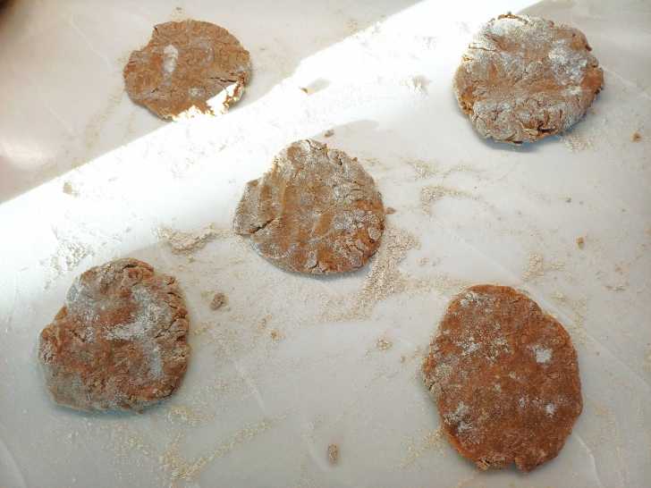 Достаём тесто, делим на 5 частей и раскатываем в лепёшки.
