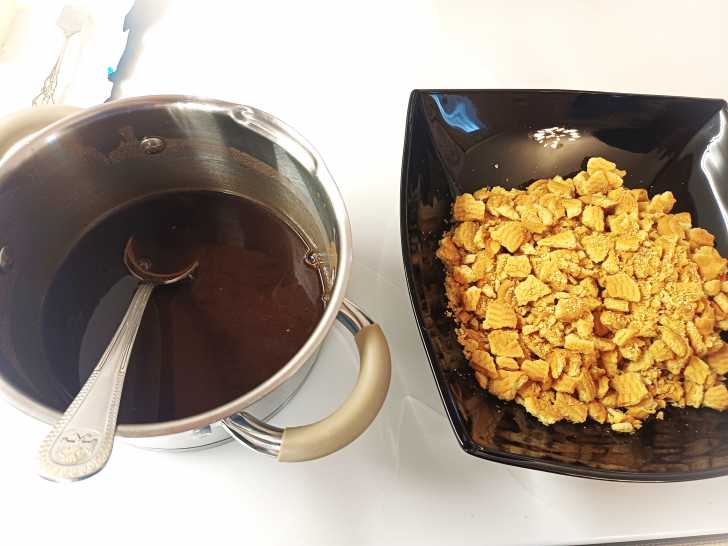 Вливаем получившуюся массу в печенье и замешиваем тесто.