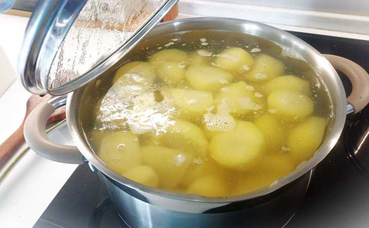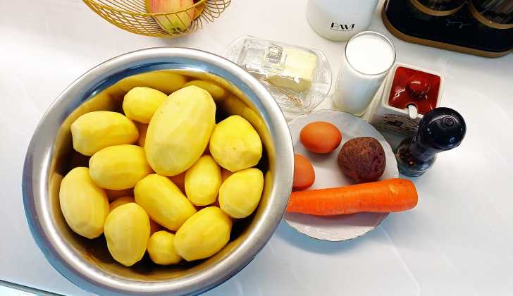 Картофель чистим, нарезаем пополам и варим 30 минут в подсоленной воде.