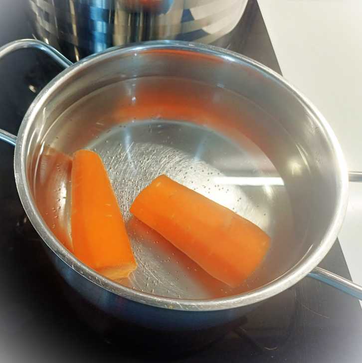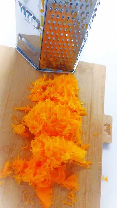 Пюре делим на 3 части. В первую добавляем натёртую на мелкой тёрке морковь и перемешиваем.