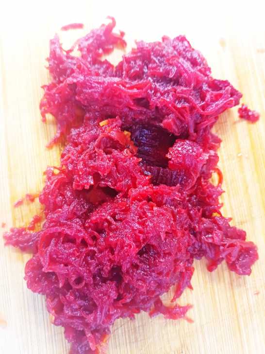 Во вторую добавляем натёртую на мелкой тёрке свеклу и тоже перемешиваем. Третью часть оставляем как есть.