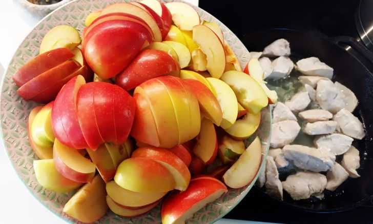 Добавляем яблоки в мясо, перемешиваем и тушим ещё 10 минут.