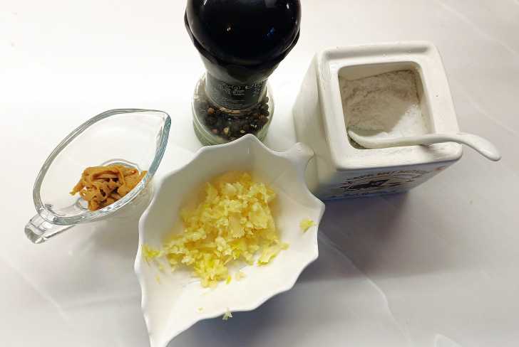 Смешиваем горчицу, истолчённый чеснок, соль и перец. Затем смешиваем мясо, картошку с морковью, и нашу чесночную заправку.