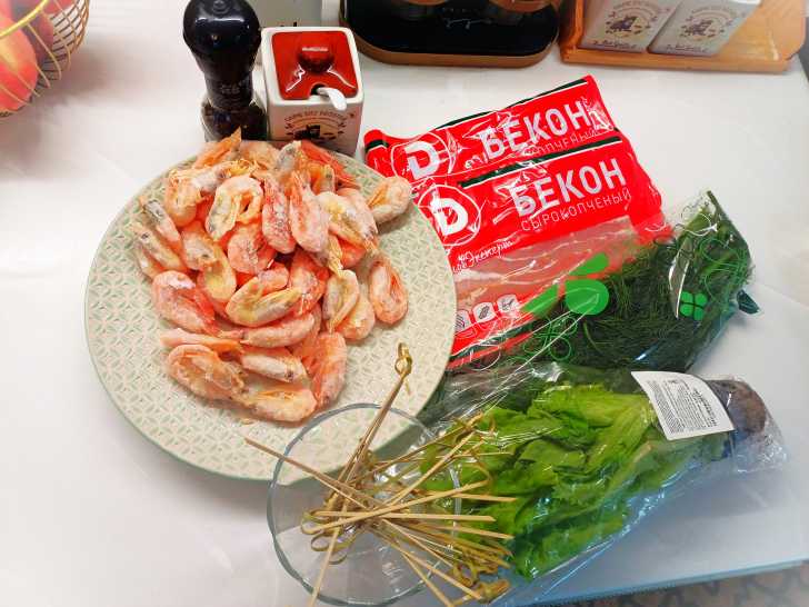 Берём ломтик бекона, нарезаем его пополам и заворачиваем креветку в половинку.