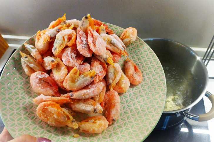 Отвариваем креветки, как указано на упаковке (либо просто пару минут), хорошо посолив и поперчив.