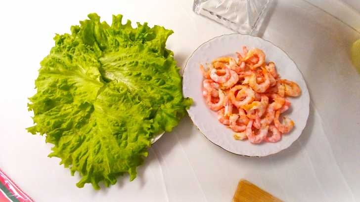 На тарелку, сначала выкладываем листья салата. Креветки мы очистили.
