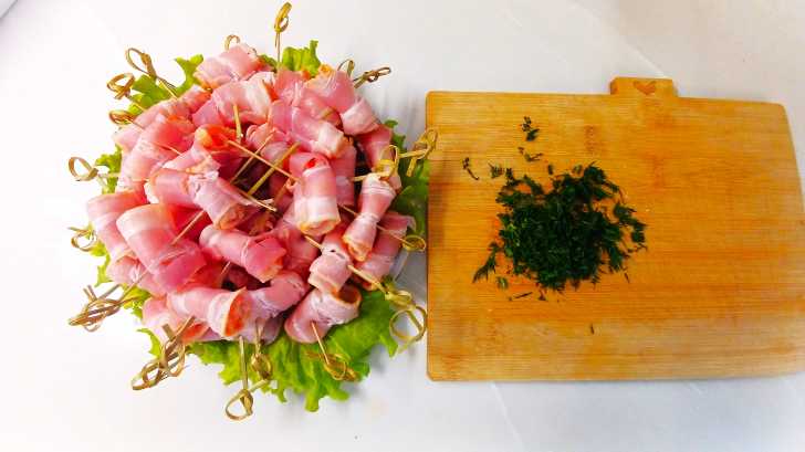 Затем нанизываем на шпажку (примерно по две штуки) и выкладываем на тарелку с листьями салата. В конце посыпаем мелко порубленным укропом.