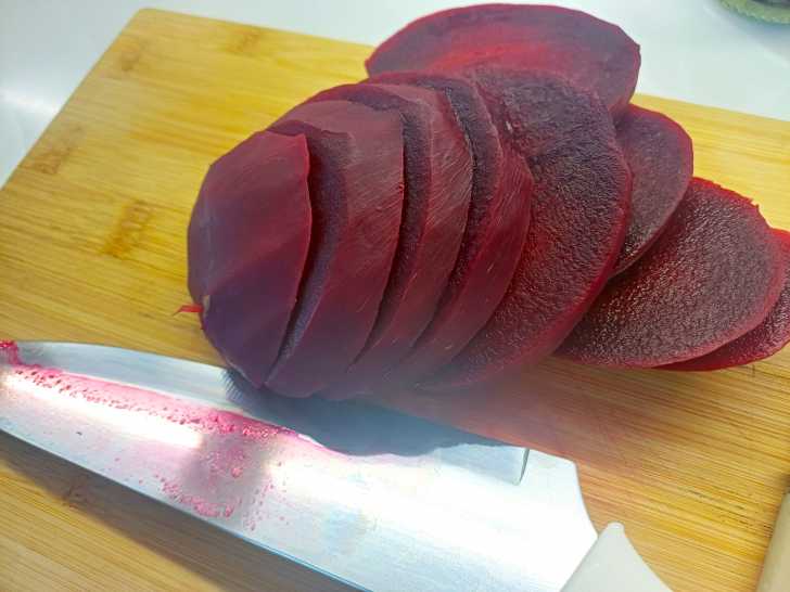 Выкладываем на сыр кружочек свеклы и разрезаем по диагонали (у нас получаются два треугольничка).