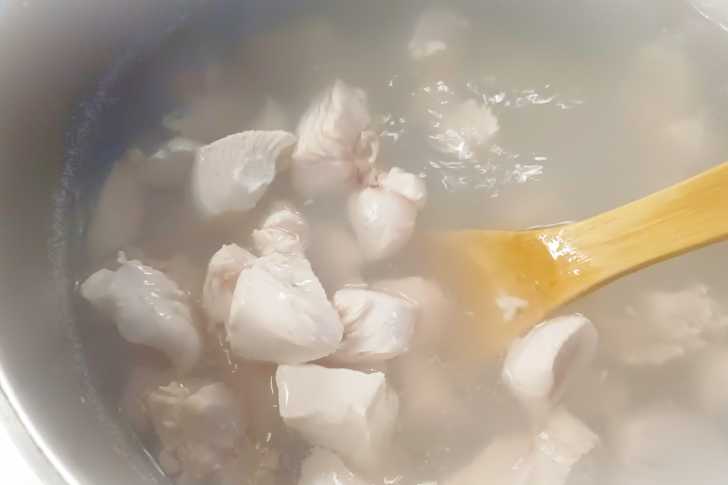 Отвариваем куриное филе (нарезанное не крупными кусочками) 10 минут, затем воду сливаем, заливаем новую, доводим до кипения и варим 50 минут на среднем огне.