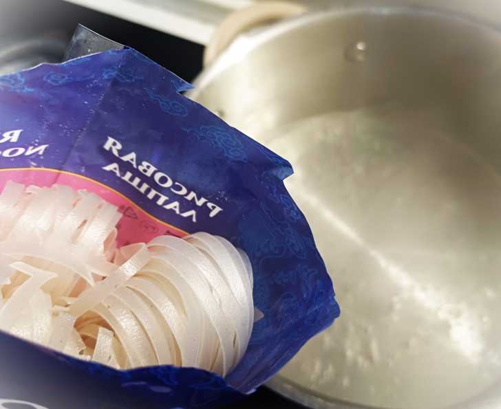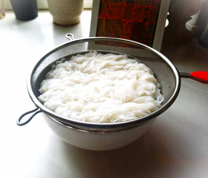 Теперь отвариваем рисовую лапшу в кипящей воде 4 минуты, затем промываем её в холодной воде. Да-да, с рисовой лапшой нужно поступать именно так.