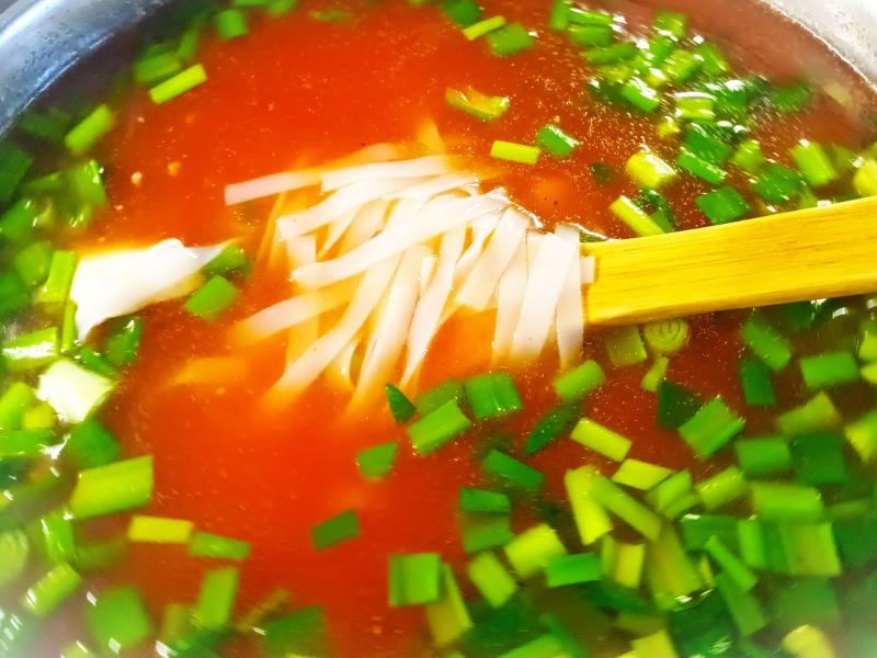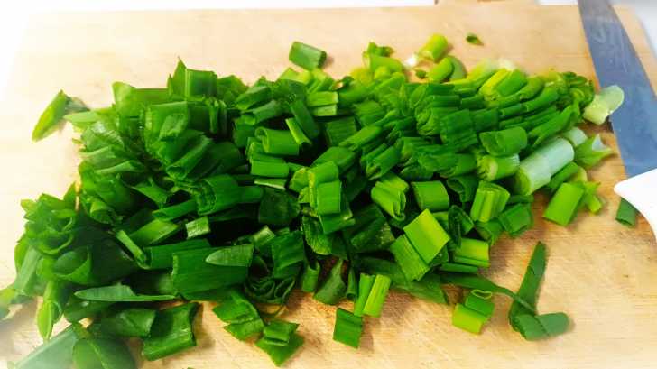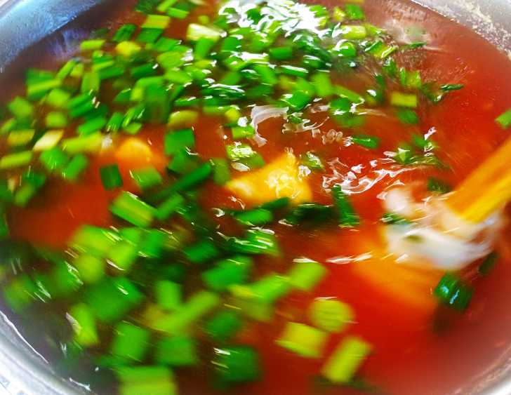 Затем добавляем в суп нашу лапшу и мелко нарезанный зелёный лук.