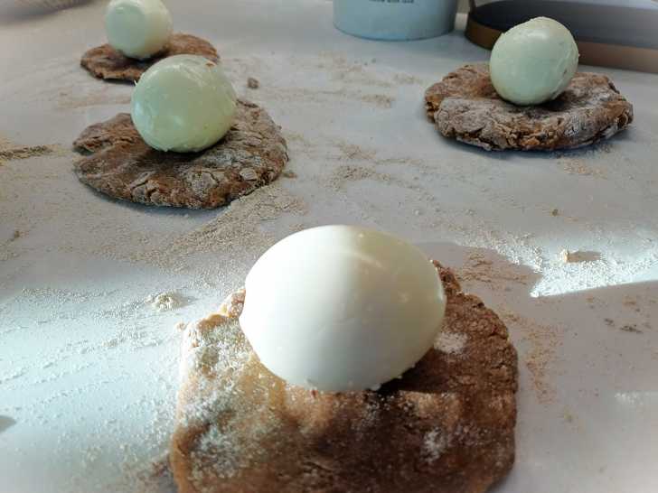 На каждую лепёшку выкладываем по яйцу и, аккуратно, растягивая тесто пальцами, начинаем их как бы заворачивать.