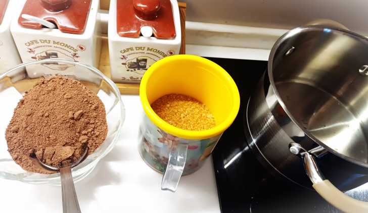 Вливаем в кастрюльку чуть больше половины стакана воды, сахар, какао-порошок, перемешиваем и доводим до кипения, снимаем с плиты и даём остыть 20 минут.