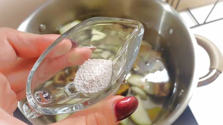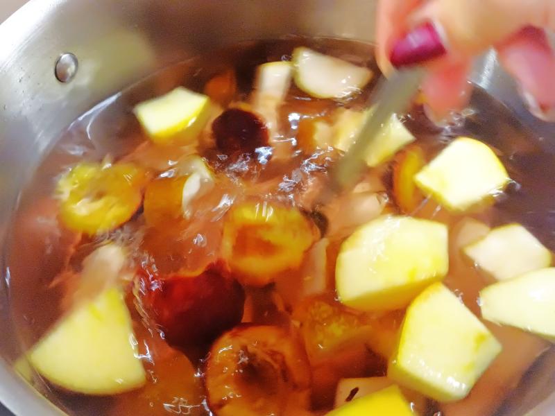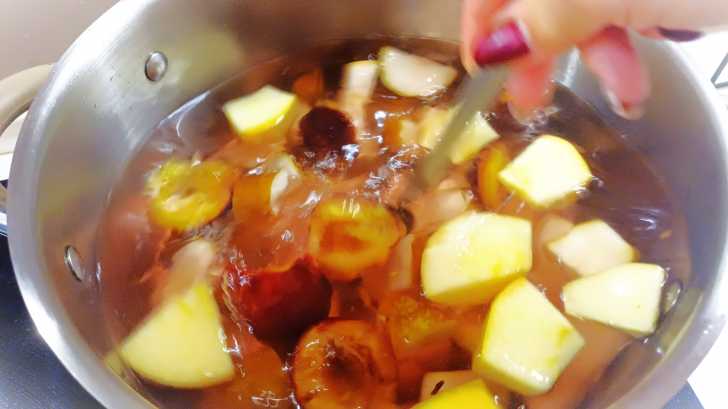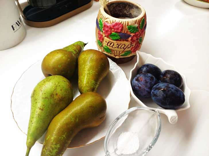 В кипящую воду закладываем сливы и груши. Всыпаем лимонную кислоту и варим на слабом огне 10 минут.