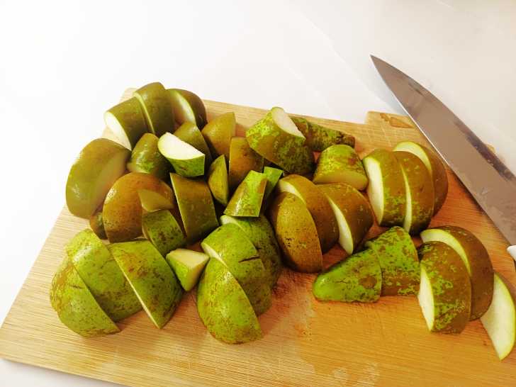 Груши чистим от семян и нарезаем средними кусочками.