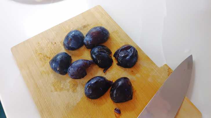 У слив удаляем косточки и нарезаем пополам.
