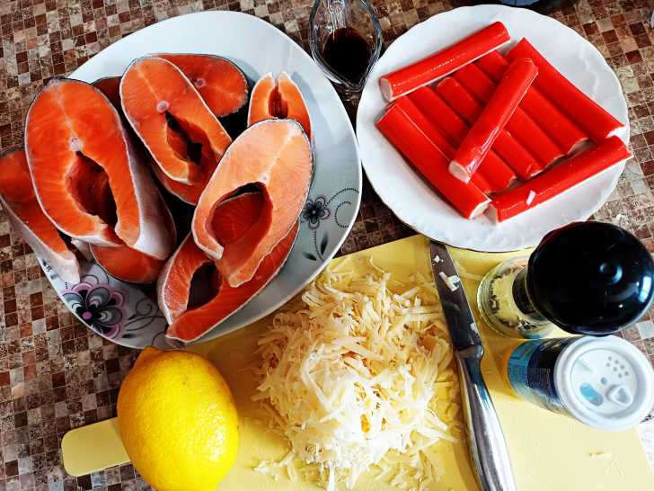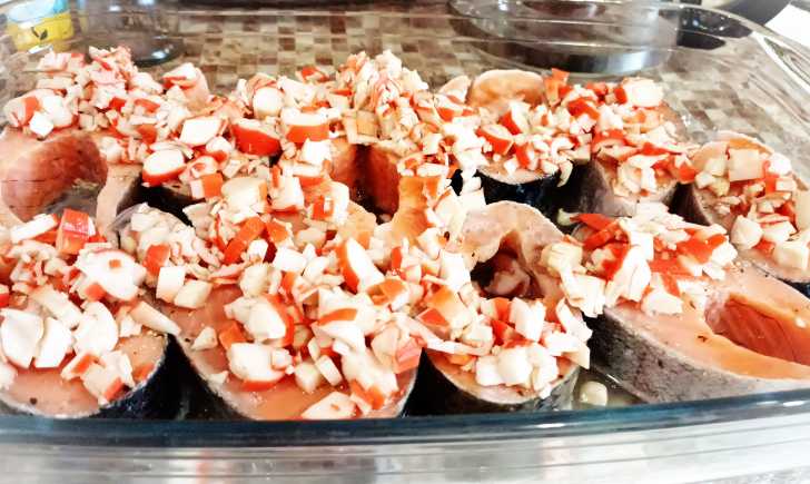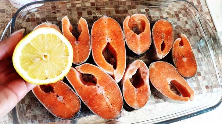 Укладываем стейки на противень (смазанный растительным маслом), хорошенько солим, перчим и поливаем лимонным соком.