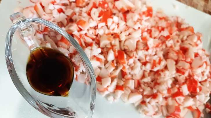 Меленько нарезаем наши крабовые палочки и смешиваем с соевым соусом.
