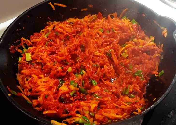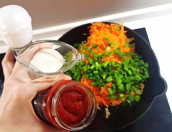 Смешиваем в сковороде морковь, лук, томатную пасту, сахар и солим.