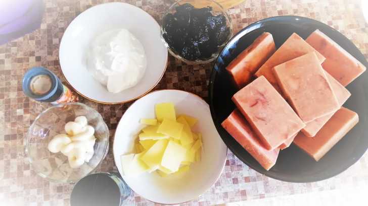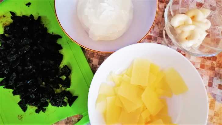 Смешиваем сметану, майонез, сыр и мелко нарезанный чернослив.