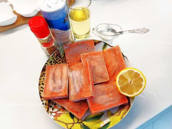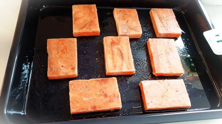 Нарезаем филе на порционные куски (или можно купить уже нарезанные, либо стейки, либо просто порционные кусочки), укладываем на противень (смазанный растительным маслом), солим и перчим.