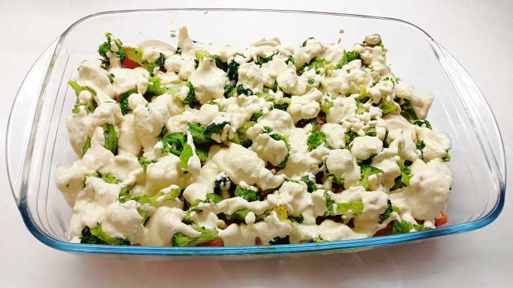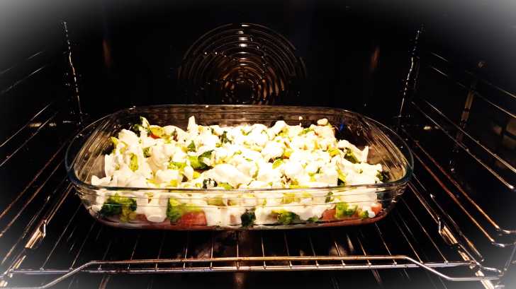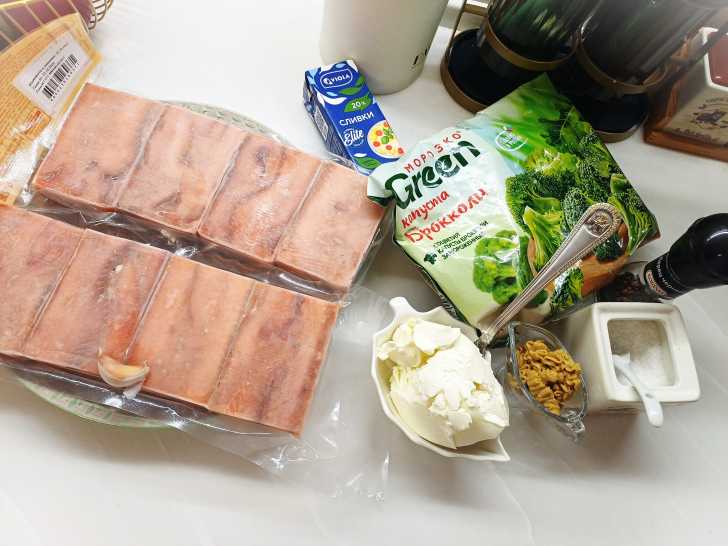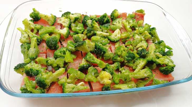 Выкладываем рыбу в форму для запекания (предварительно смазанную растительным маслом), солим, а сверху распределяем брокколи (я её нарезаю на более мелкие соцветия). Можете пока включить духовку, пусть разогревается до 200 градусов.