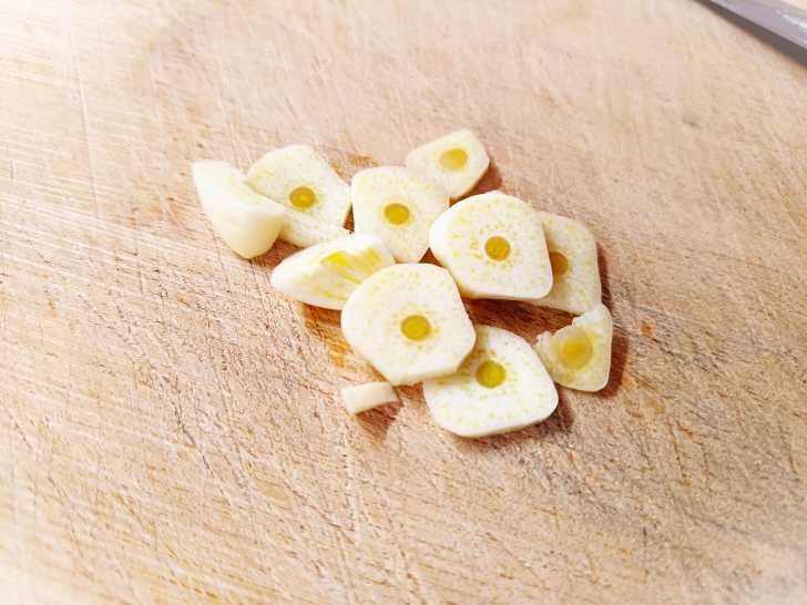 Чеснок нарезаем тонкими пластинками.