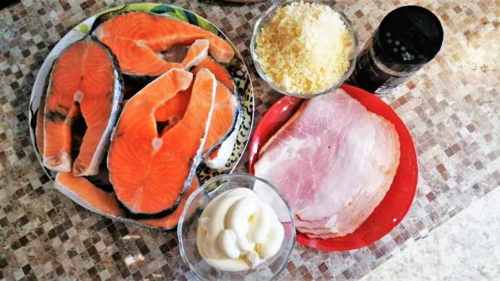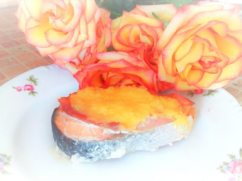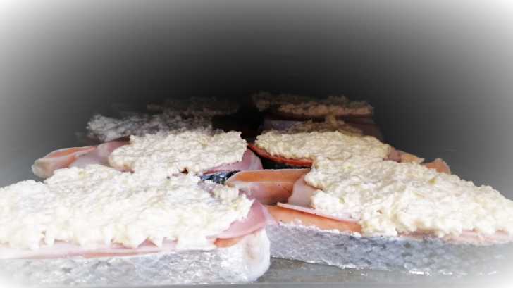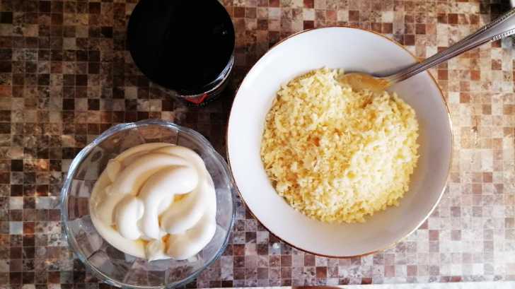 Смешиваем майонез, натёртый сыр, немного солим и также распределяем по стейкам.