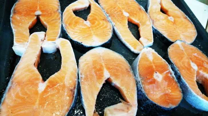 Укладываем стейки на противень (смазанный растительным маслом) и солим их.