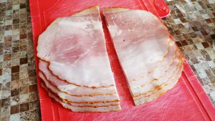 Нарезаем ветчину, как указано на фото и раскладываем по стейкам.