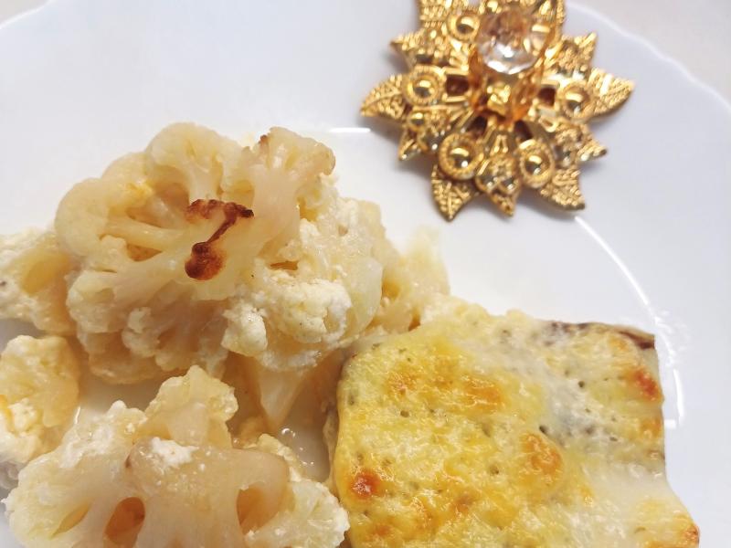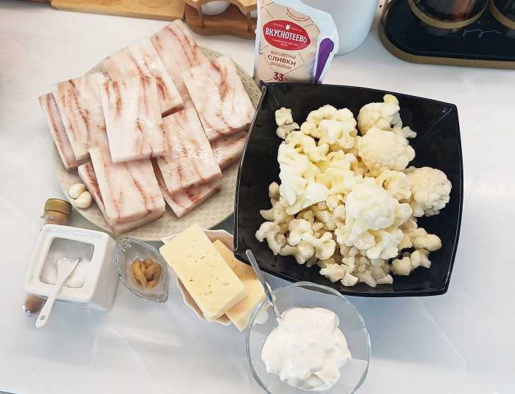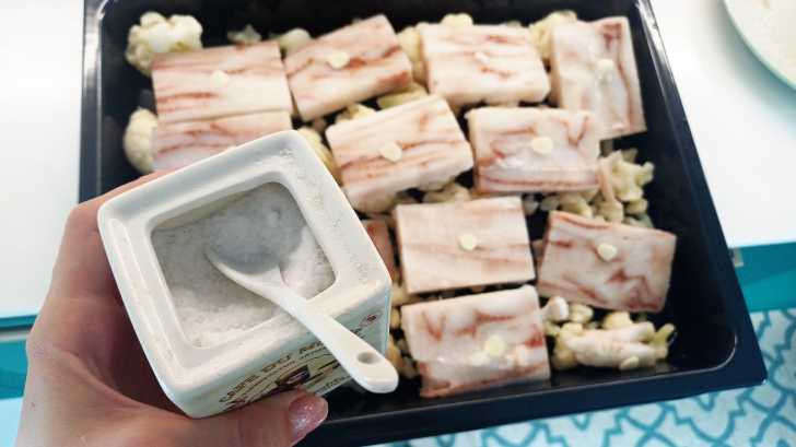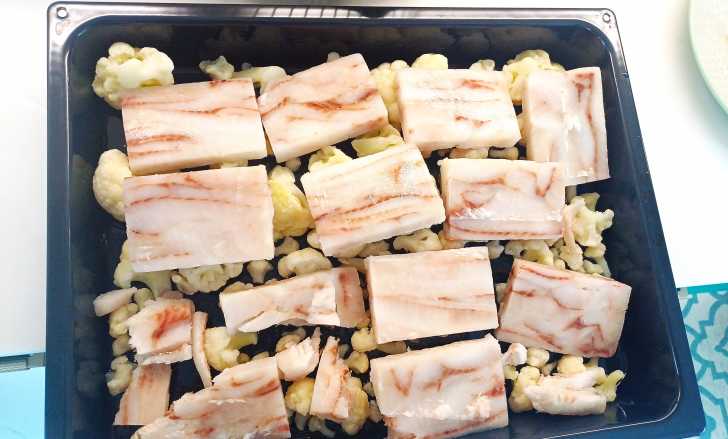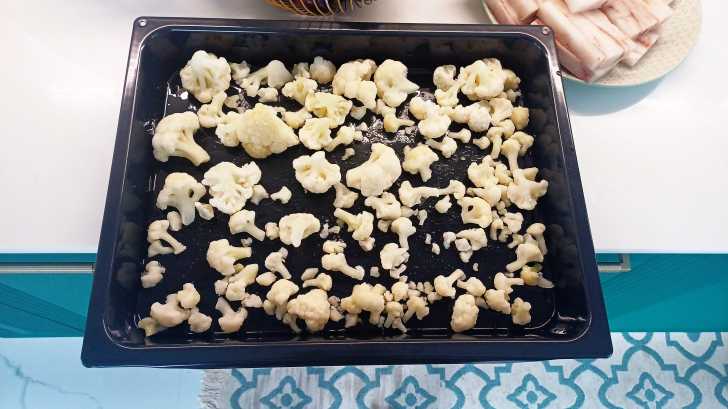 На предварительно смазанный противень раскладываем цветную капусту и слегка солим.