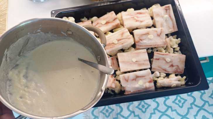 Распределяем наш сливочный соус по кусочкам рыбы.