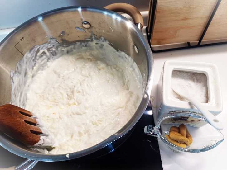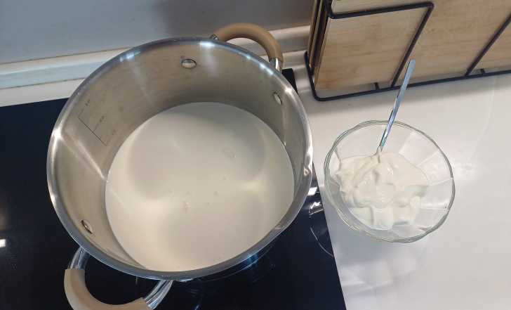 Разогреваем молоко и добавляем в него сметану, перемешиваем.