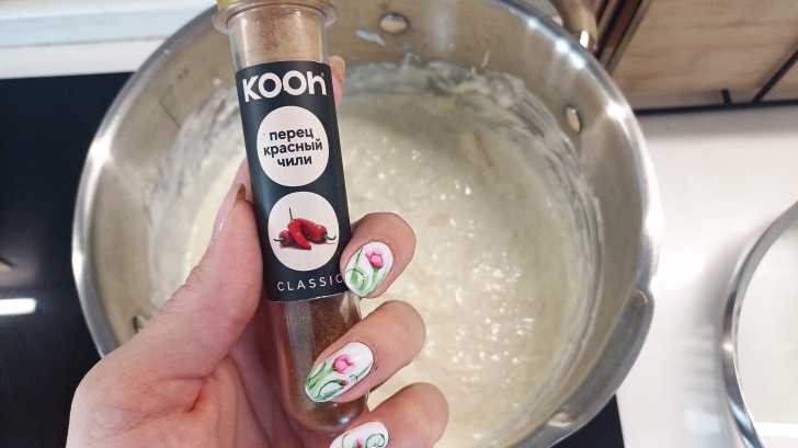 Перчим. Лучше взять перец чили, но можно и любой другой. Больше или меньше, здесь на ваше усмотрение. Перемешиваем, выключаем огонь и убираем с плиты.