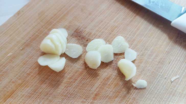 Тоненько нарезаем чеснок и распределяем по рыбке, хотя бы по 1 пластиночке на каждый рыбный кусочек.