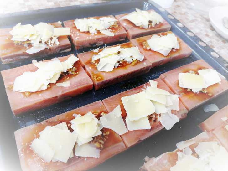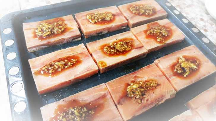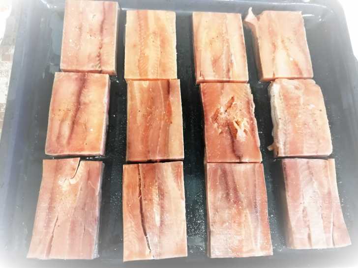 Нарезаем филе на порционные кусочки, солим, перчим и укладываем на противень (предварительно смазанный растительным маслом). Можно и купить уже порционные кусочки!