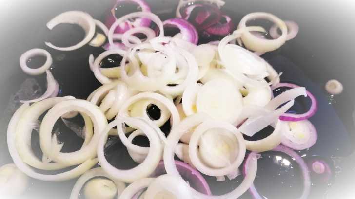 Обжариваем лук, нарезанный кольцами, пару минут.
