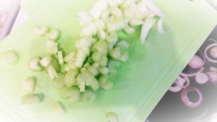 Добавляем к луку мелко нарезанный сельдерей, перемешиваем, солим и обжариваем ещё пару минут.
