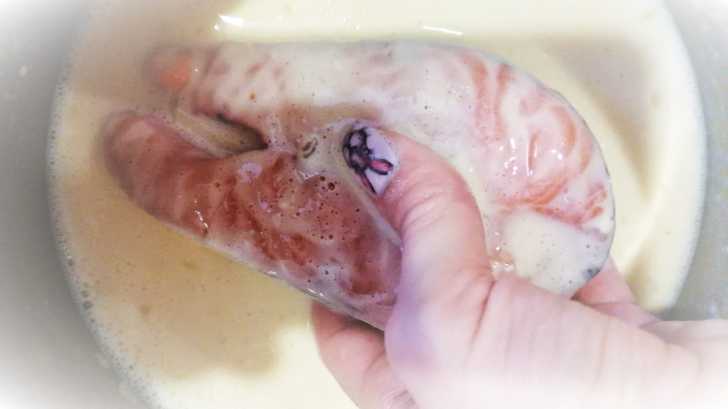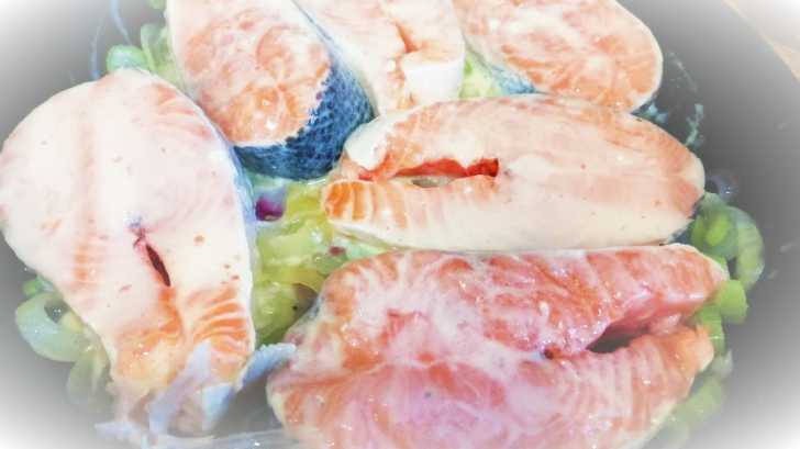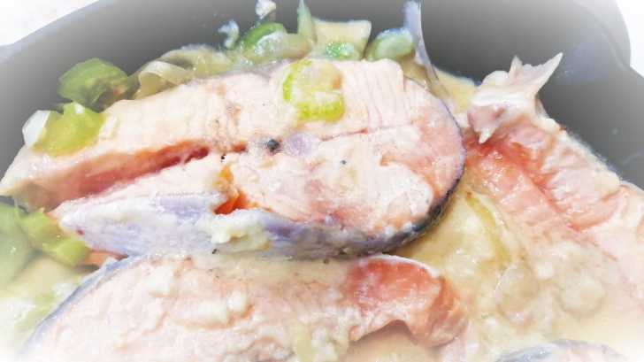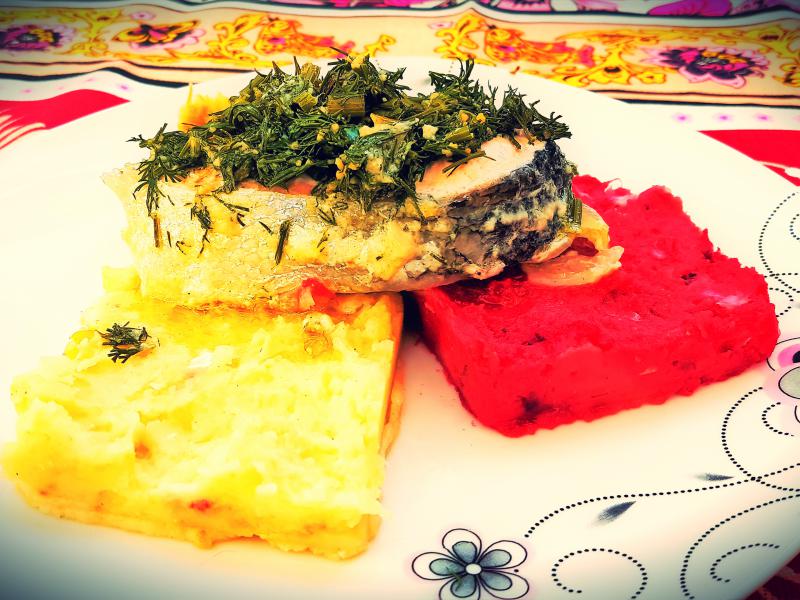 Затем переворачиваем, солим, перчим и тушим ещё 5 минут. Перед подачей на каждый стейк мы укладываем лук с сельдереем (которые мы обжаривали) и можно, по желанию, ещё добавить мелко порубленного укропа.
