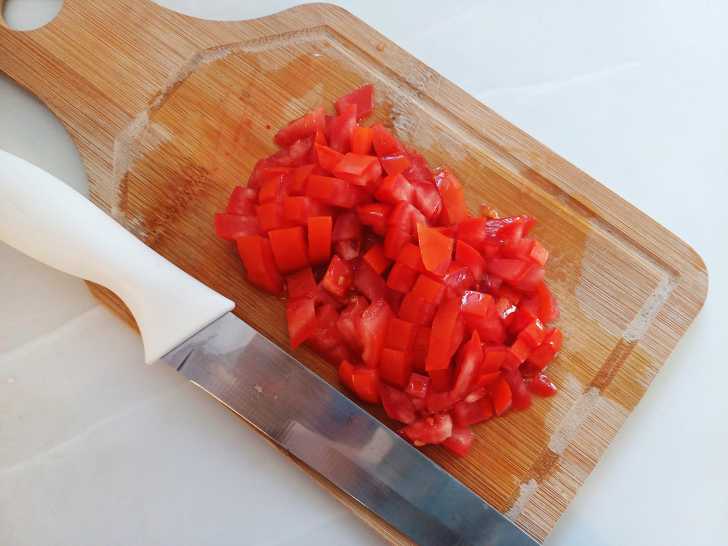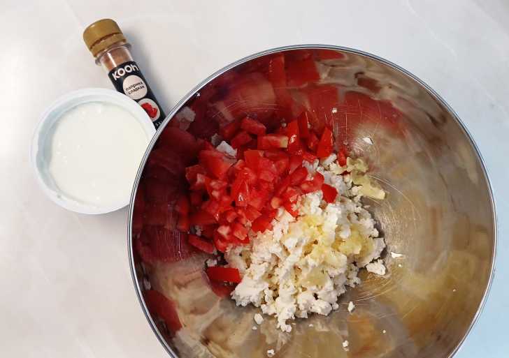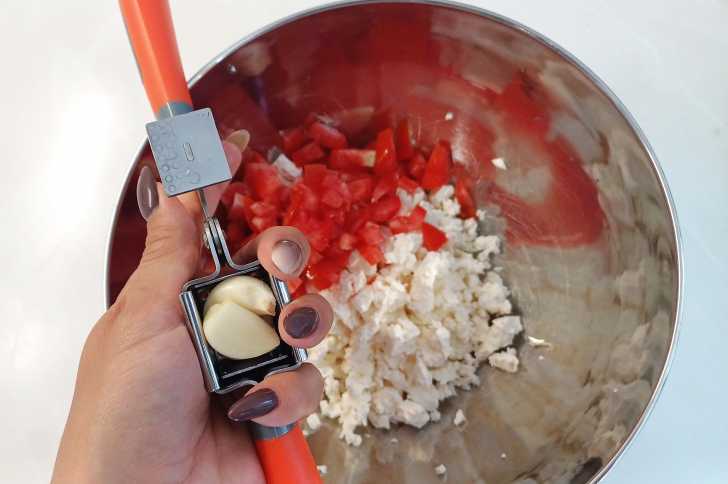 Соединяем в миске помидор, сыр и истолчённый чеснок.