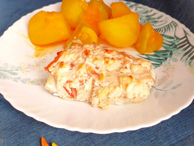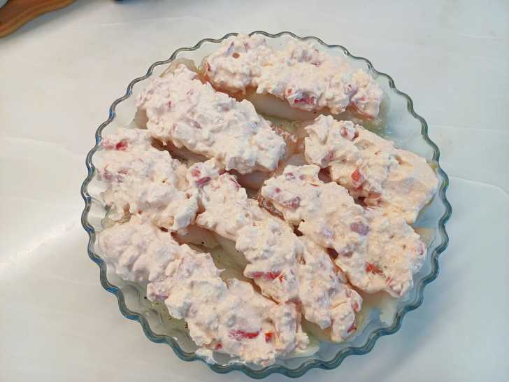 Затем туда же добавляем сметану и сладкую паприку (молотую). Перемешиваем и отставляем в сторонку.