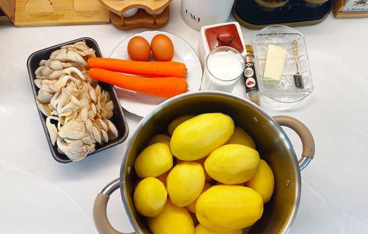 В картофель добавляем яйца, молоко, сливочное масло, соль и перец, и делаем пюре. Если вы брали морковь (это можно делать по желанию), то добавляем наше морковное пюре и тщательно перемешиваем.