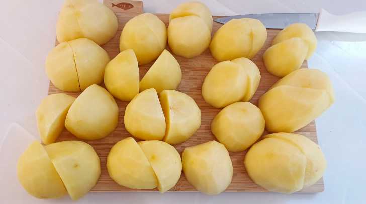 Картофель чистим и нарезаем пополам (если у вас картофель очень крупный, то на 4 части). Отвариваем до готовности в подсоленной воде.