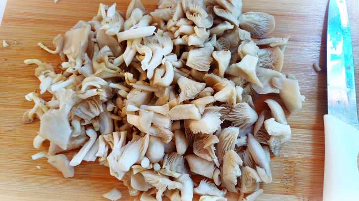 Вешенки меленько нарезаем. Обжариваем на среднем огне 10 минут. Солим и перемешиваем.