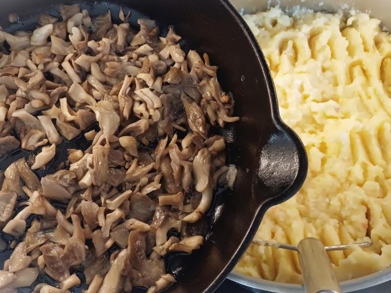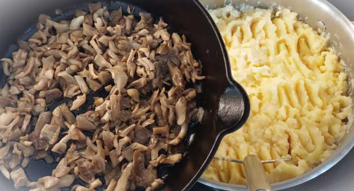 Отправляем наши вешенки к картофелю и перемешиваем.