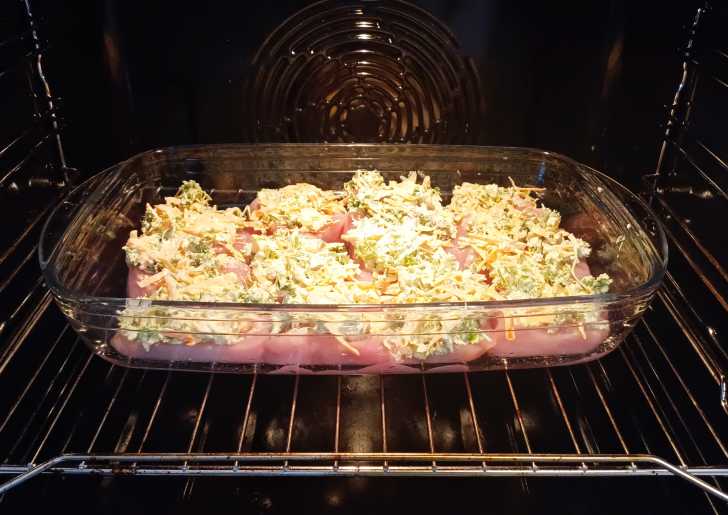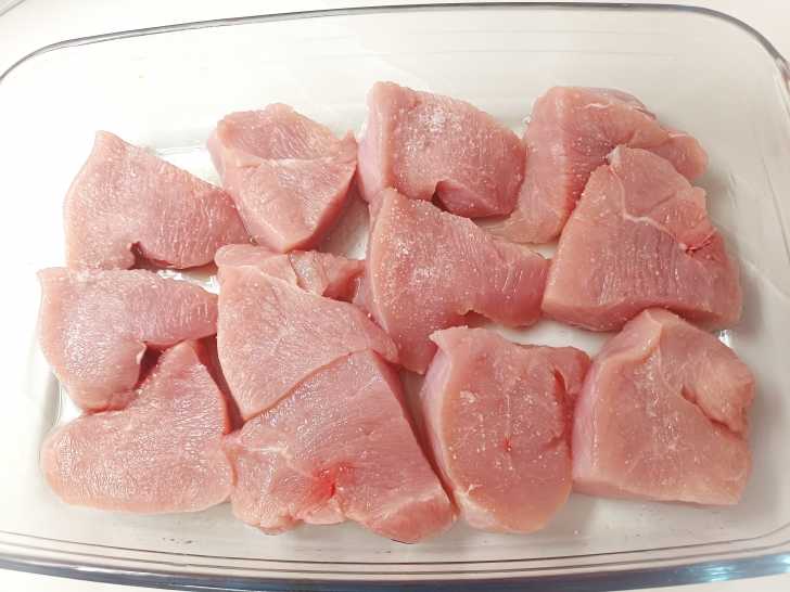 Индейку нарезаем небольшими медальончиками и выкладываем в форму для запекания (предварительно смазанную маслом). Солим.