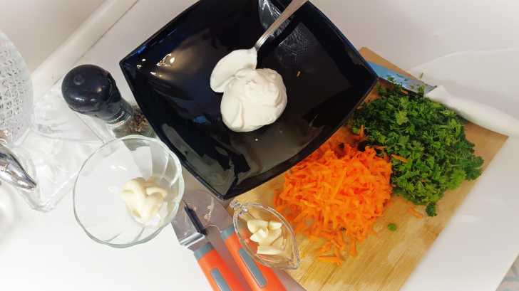 Смешиваем истолчённый чеснок, натёртую морковь, мелко порубленную зелень, майонез, сметану и перчим.