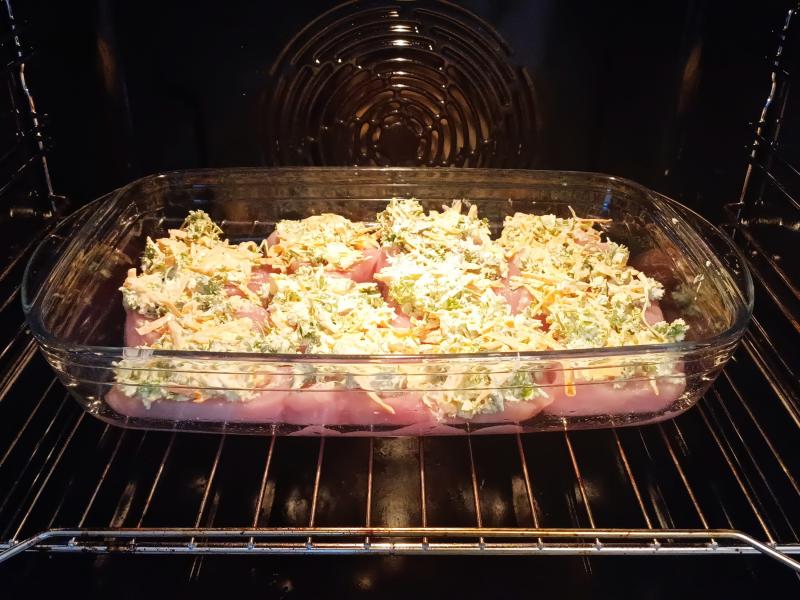 Распределяем по мясу. И включаем духовку, разогреваем её до 200 градусов.