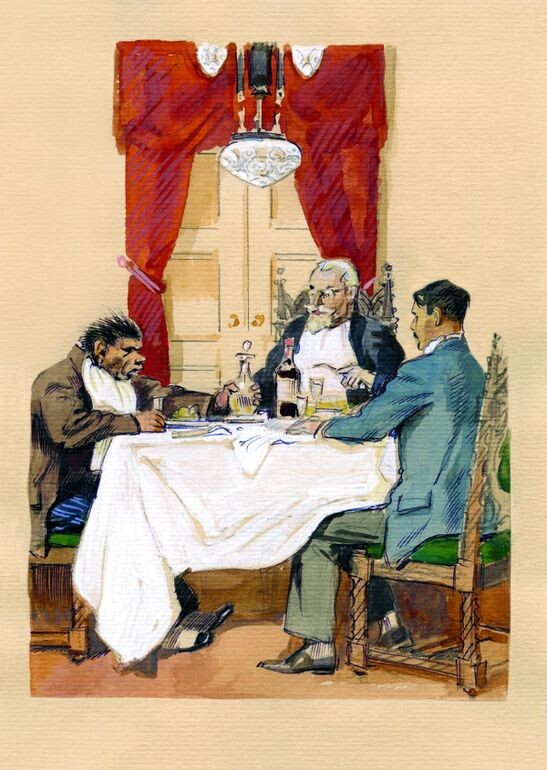 «… На разрисованных райскими цветами тарелках с чёрной широкой каймой лежала тонкими ломтиками нарезанная сёмга, маринованные угри. На тяжелой доске – кусок сыру в слезах, и в серебряной кадушке, обложенной снегом, - икра. Меж тарелками – несколько тоненьких рюмочек и три хрустальных графинчика с разноцветными водками. Все эти предметы помещались на маленьком мраморном столике, уютно присоседившемся у громадного резного дуба буфета, изрыгавшего пучки стеклянного и серебряного света. Посредине комнаты тяжёлый, как гробница, стол, накрытый белой скатертью, а на ней два прибора, салфетки, свёрнутые в виде папских тиар, и три тёмных бутылки…»