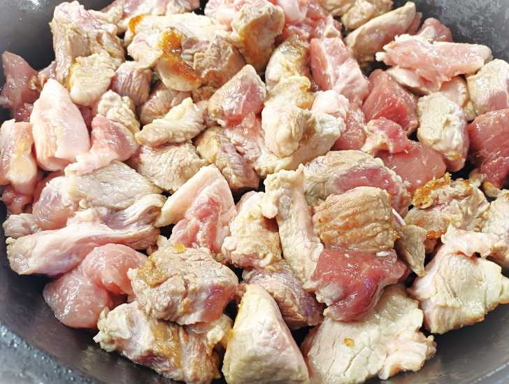 Нарезаем баранину не крупными кусочками, солим, перчим и обжариваем 10 минут;